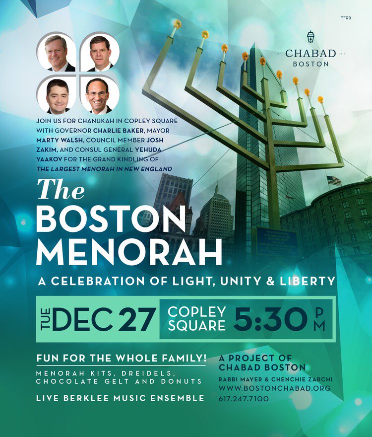 City of Boston Mayor’s Office (flickr) “December 27, 2016 - Mayor Martin Walsh joins Governor Charlie Baker, Councillor Josh Zakim, Council General of Israel to New England Yehuda Yaakov and the leadership of Chabad Boston for the festival of lights on the fourth day of Chanukah in Copley Square.”