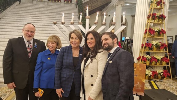 Instagram post by Israel in Boston “It was truly special to light the seventh Hanukkah candle with Central Synagogue Boston and MA state leaders, including Governor Healey, Senate President Spilka, Senator Cindy Creem and Secretary Bill Galvin at the State House.”