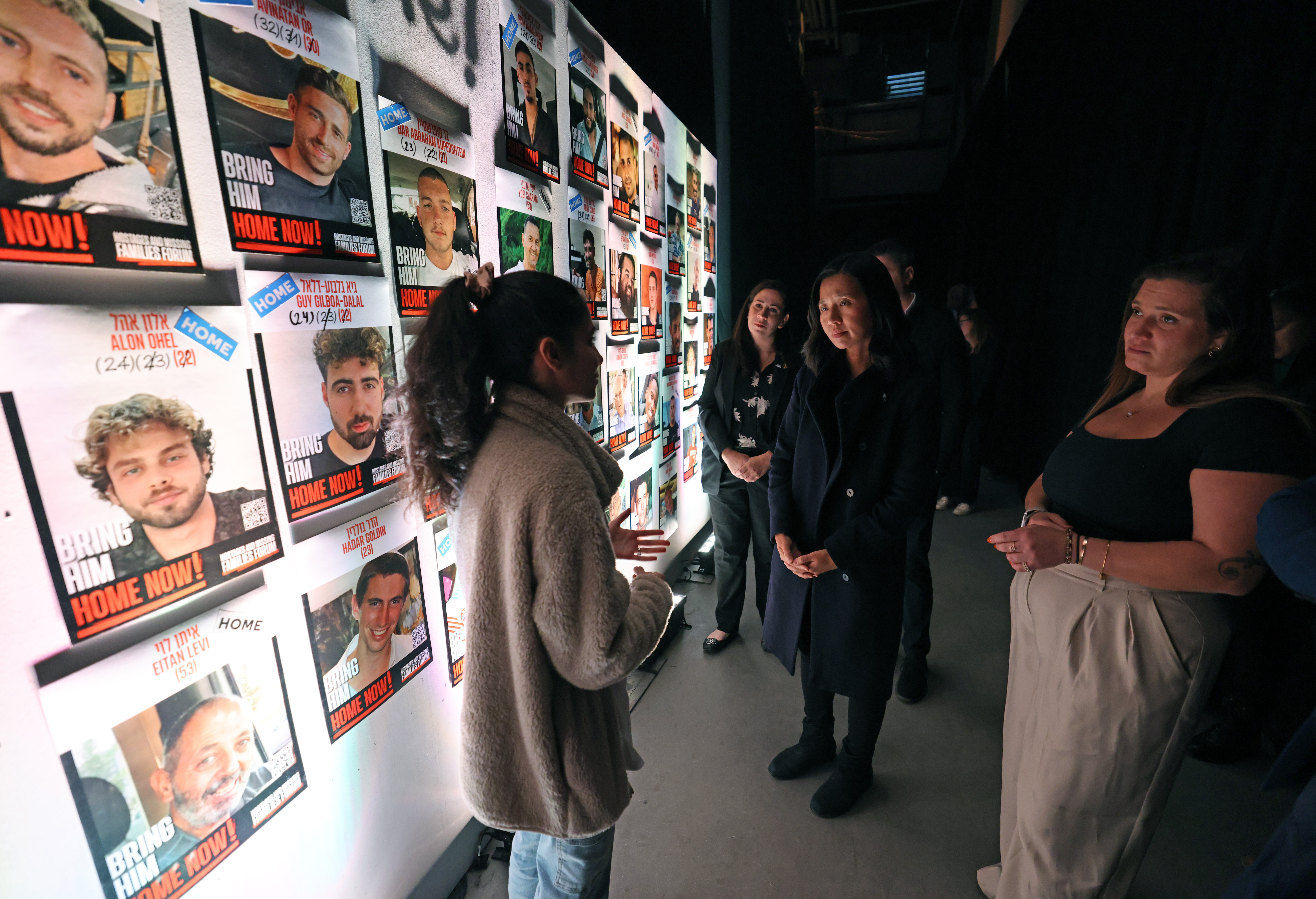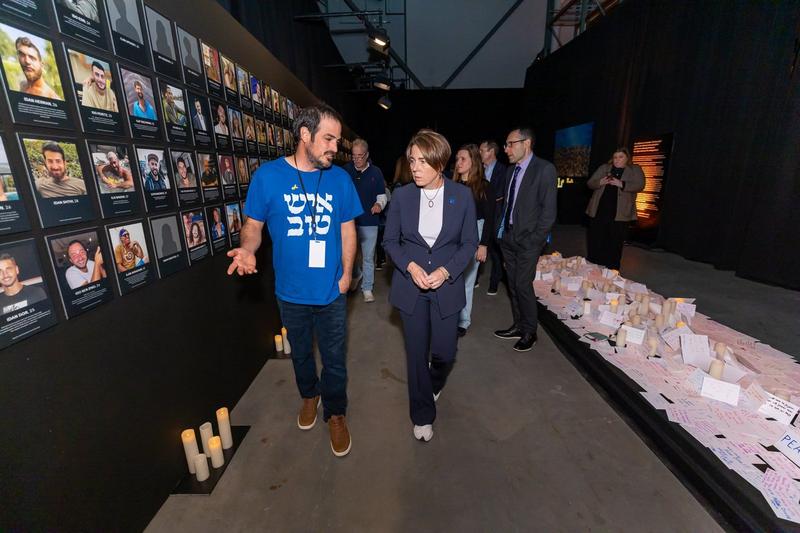 Mayor Michelle Wu views the hostage poster wall at the Nova Exhibition